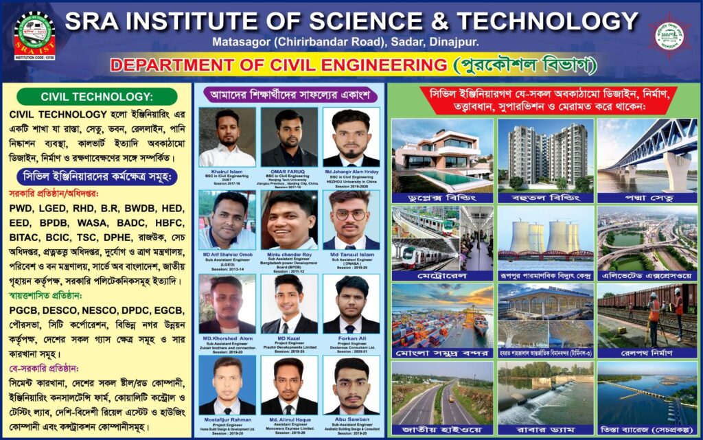 The Civil Engineering Department of SRAIST is one of the most important and dynamic branches of engineering education. Civil Engineers play a vital role in building and maintaining the infrastructure of a nation — from roads and bridges to buildings and water supply systems. Today, the demand for skilled Civil Diploma Engineers is higher than ever before, both in Bangladesh and abroad.